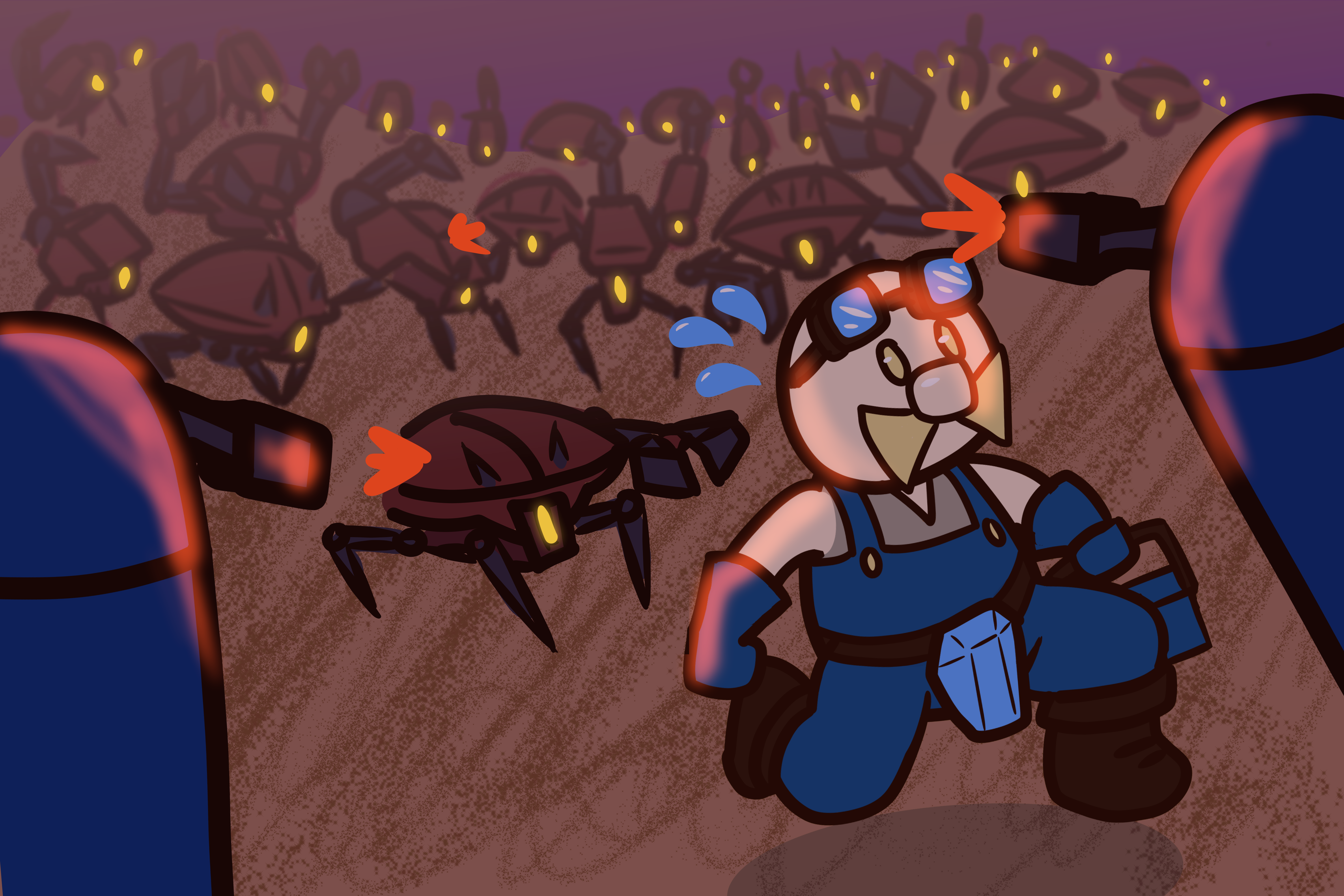 Mars Mech Mission is a tower defense game about a lone dwarf who has to defend his space base from robotic crabs and scorpions.